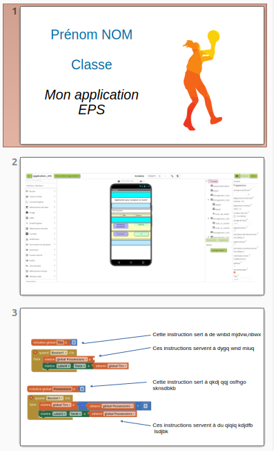 - Sur la troisième page, coller une capture d'écran de la page "Blocs" du site App Inventor. Ajouter un commentaire pour expliquer le rôle des blocs de programmation.