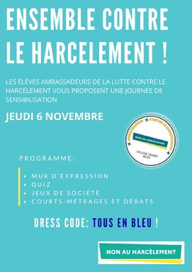 Les élèves et les personnels sont invités à porter du bleu, couleur symbole de la lutte contre le harcèlement. Des rubans bleus seront distribués à l’entrée du collège par les ambassadeurs.